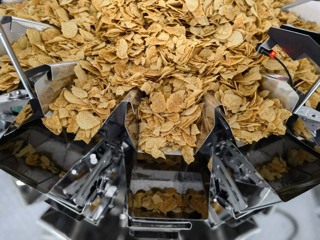 This advanced 14-head 2.5L Multihead weigher is engineered for high-speed, precise weighing of lightweight, irregular, and fragile products like potato chips. Featuring a generous 2.5-liter feed hopper capacity per head, it efficiently handles the low bulk density and large volume of chips while minimizing product damage.